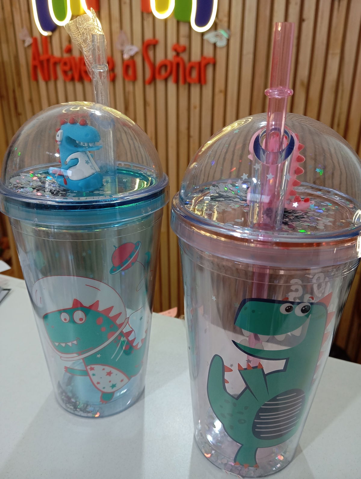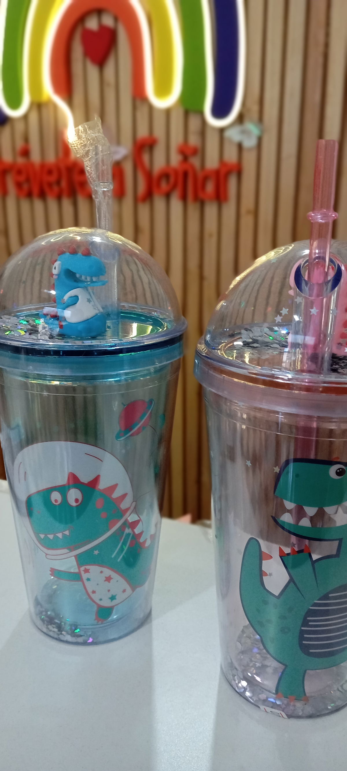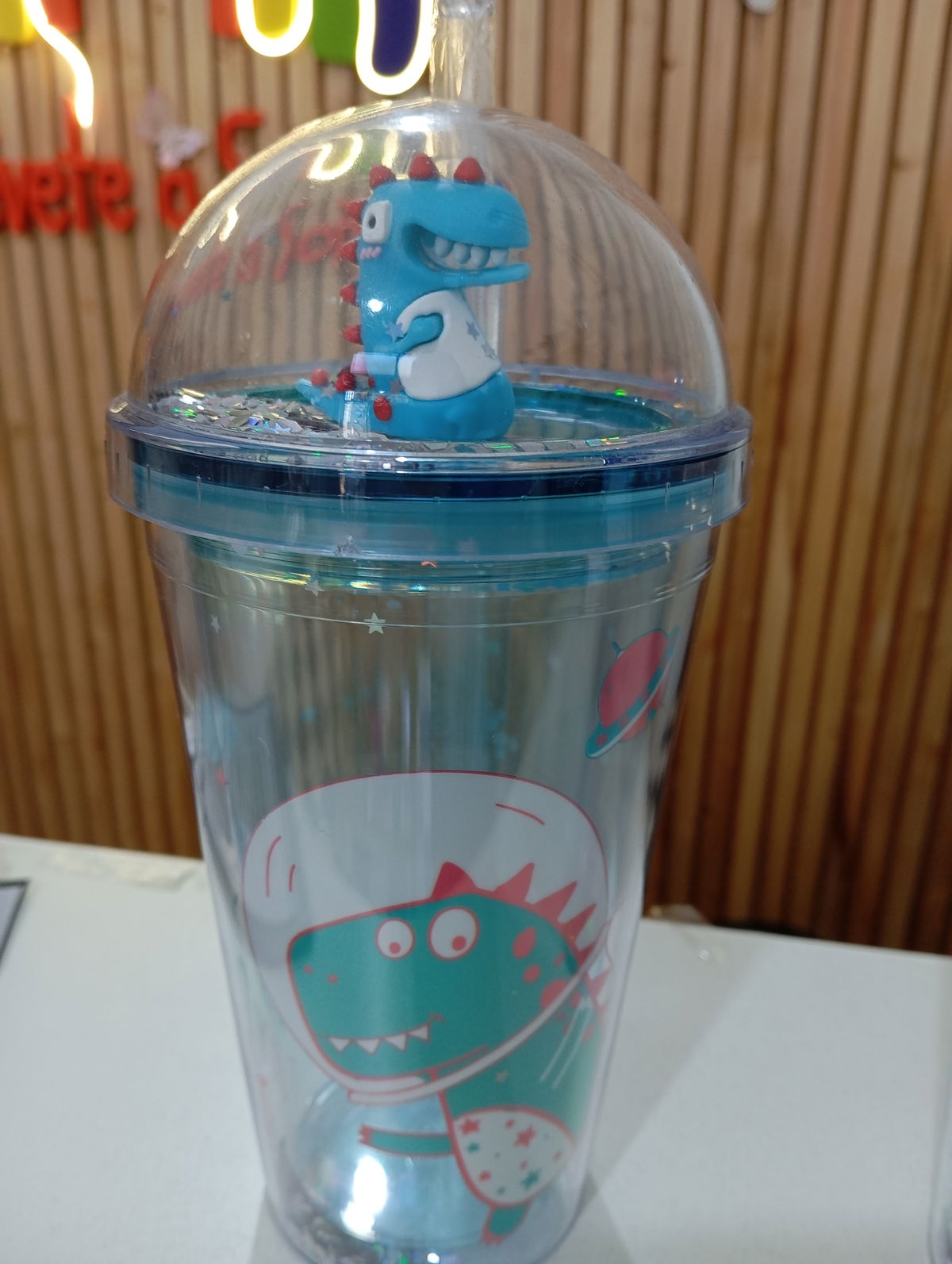 vaso con tapa dino con brillo